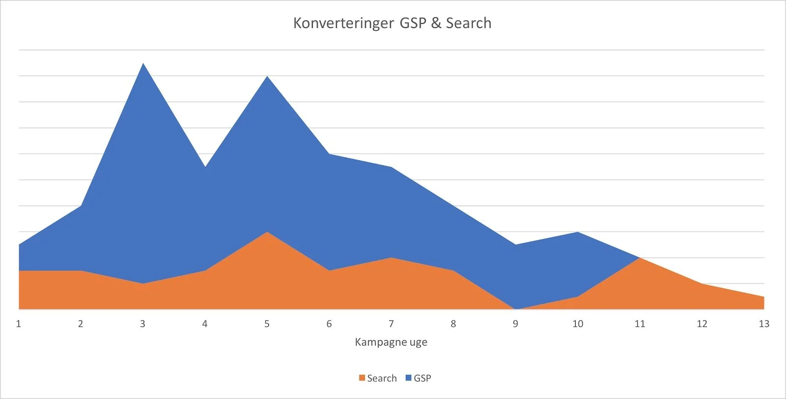 På grafen ses antallet af donationer fra hhv. search (orange) og Gmail ads (blå), hvor det er tydeligt, at Gmail annoncerne gav væsentlig flere donationer.